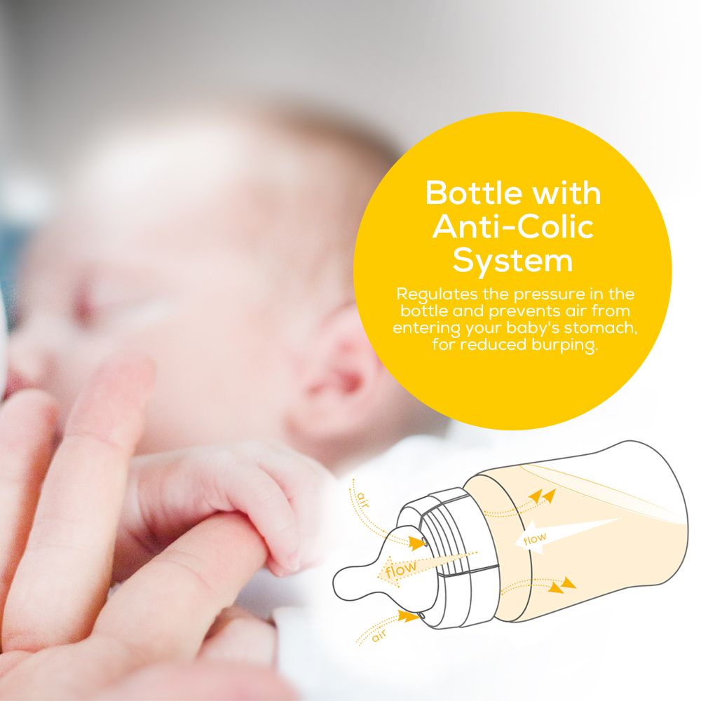- Bottle with anti-colic system for reducing colic and discomfort in infants.