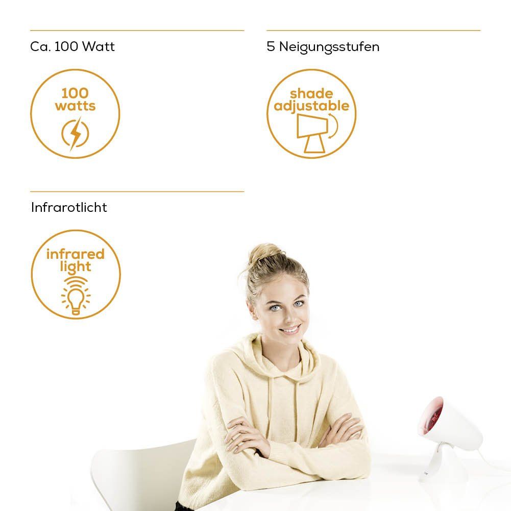 This infrared lamp is a certified medical device that works with a 100-watt emitter. It is advised to maintain a distance of at least 60 cms from the device. A duration of 12 minutes for each treatment is recommended.