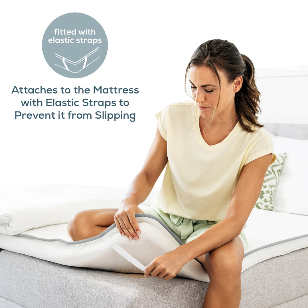 - Attaches to the mattress with elastic straps to prevent it from slipping