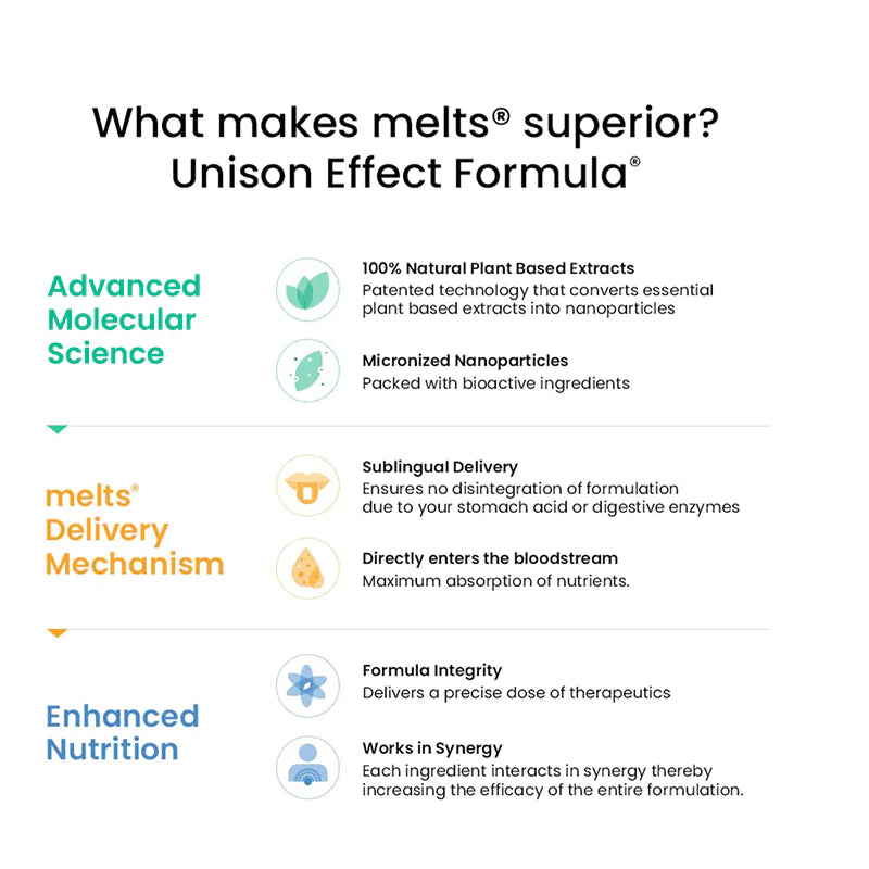 melts® are rapid dissolving nano strips that convert key plant-based extracts into nano particles. These strips 'melt' upon coming in contact with your tongue to ensure easy and complete absorption of all the goodness and nutrients in an extremely enjoyable and fun manner.