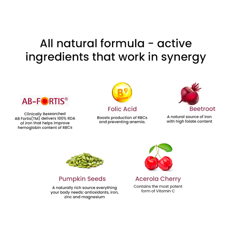 Naturally extracted Folic Acid meets Beetroot and Acerola Cherry for a potent delivery of high-concentration Iron (AB-Fortis®) and increased Haemoglobin production.