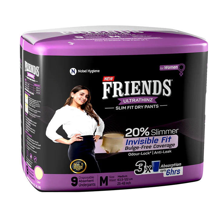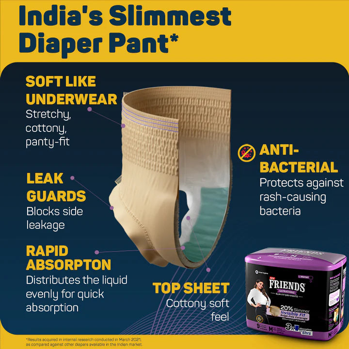 - Curves Friendly: India’s first female adult diaper pants, UltraThinz are designed to fit the female body. An extra-stretchy waistband and flexible side-leg guards make for a snug, invisible fit, even under the tightest clothing.