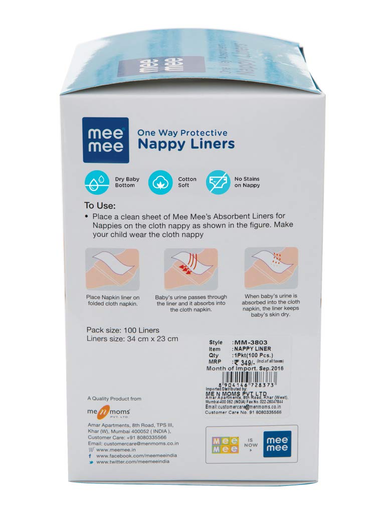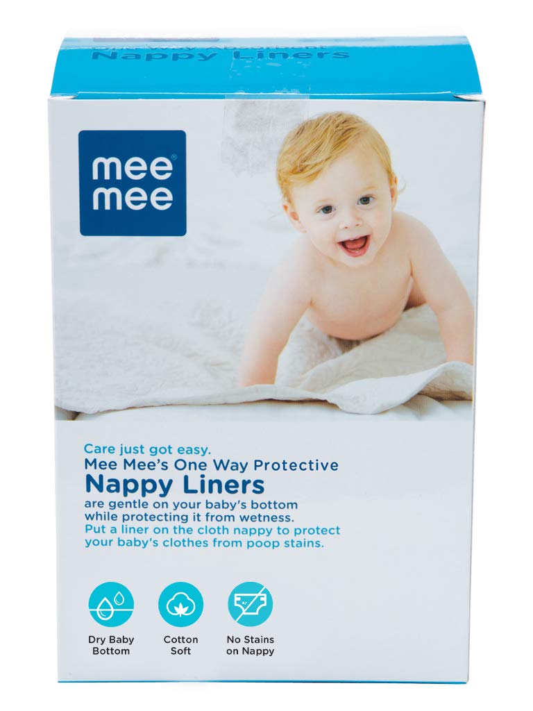 The Mee Mee one-way nappy liners (100 liners) have been specially designed to provide superior quality comfort to your little one's soft and sensitive skin. This pack of Mee Mee one-way nappy liners contains 100 liners that are perfect for use with reusable pads and nappies. Covered with gentle non-woven cloth, these under pads are made of environment-friendly, 100 percent biodegradable cellulose fibres. Just a single sheet of Mee Mee nappy liners is enough to keep your baby dry and comfortable through the day. It is particularly helpful for times when you need to use nappy rash creams.