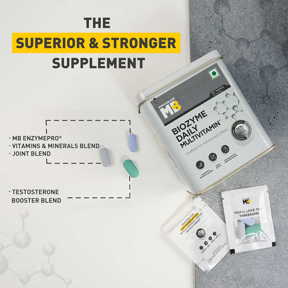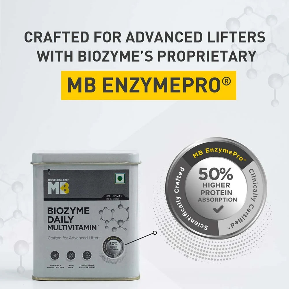 - Power of Biozyme: MuscleBlaze Biozyme Daily Multivitamin is more than just a multivitamin with our proprietary and clinically tested MB EnzymePro that has Enhanced Absorption Formula(EAF) to ensure 50% higher protein absorption and keep stomach issues miles away