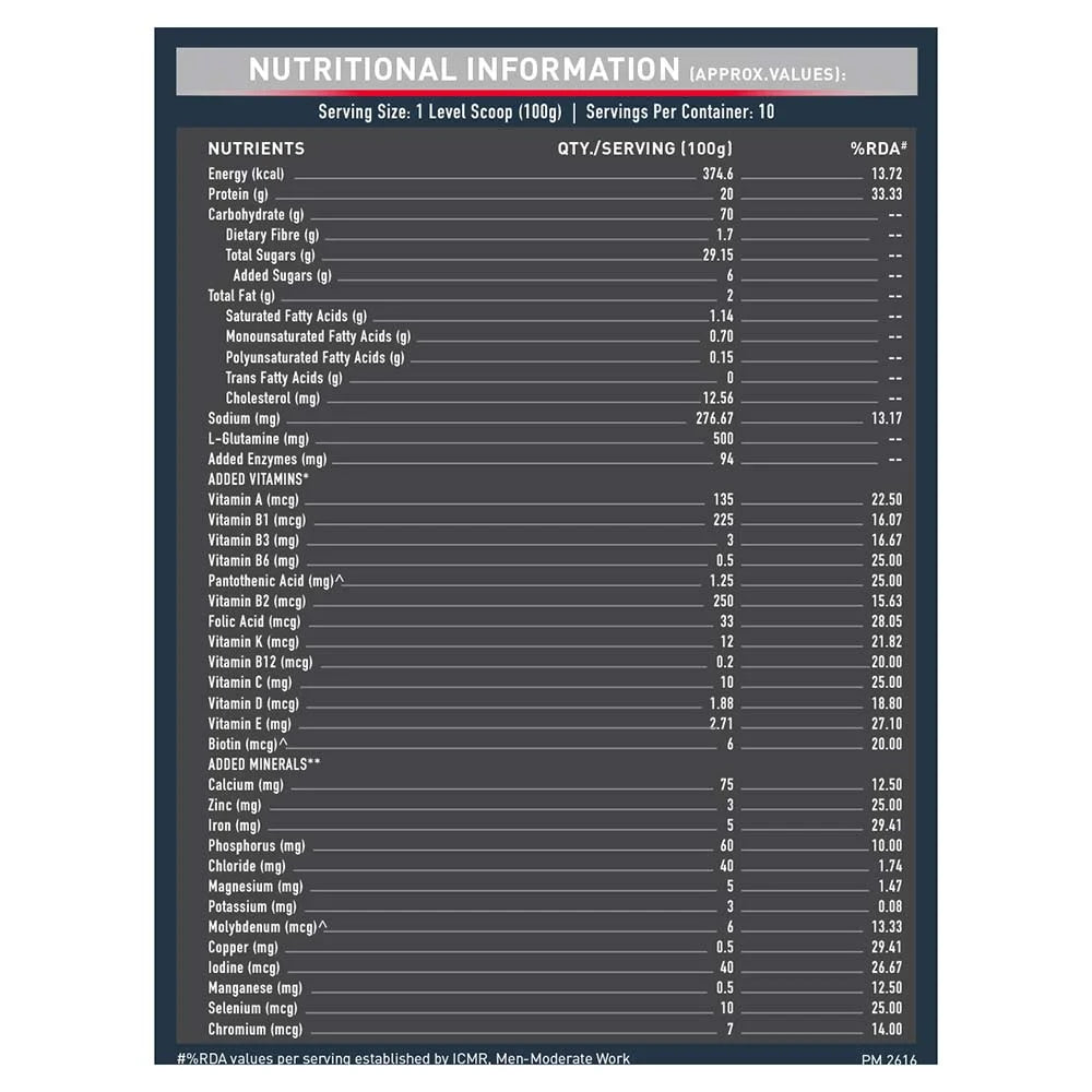 Steady source of energy: Every serving delivers a perfect blend of slow and fast-metabolising carbohydrates, which help maintain a stable supply of calories. These are used as fuel to provide energy to support your grind at the gym. Take on the toughest of challenges and ace them. With 1361 kcal backing you up, you will be an energy powerhouse.