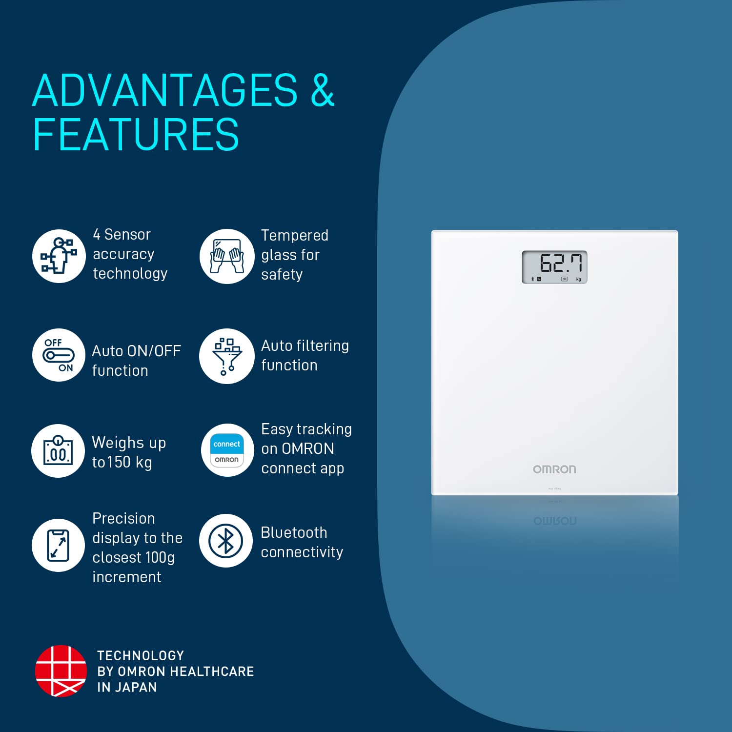 - 4 Sensor Accuracy Technology, Auto ON/OFF Function, Weighs upto 150 Kg, Precision display to the closest 100g increment, Tempered glass for saftey