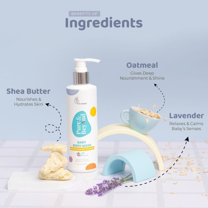 Bath times are always fun. But what if we tell you they can be more fun and safer? Sounds exciting, right? R for Rabbit is bringing you gentle and nourishing body wash with its Pure & Beyond Baby Body Wash. Made with plant-based natural ingredients like Oatmeal and Shea Butter, this body wash for babies enriches baby skin with deep nourishment and hydration. It even has Lavender Oil which assists babies to relax and feel calm after their bath. Tear-free and pH-balanced composition of Pure & Beyond Baby Body Wash assures a pleased bath time full of fun. You can now give the best body wash for babies in India with worry-free baths because our body wash for babies is chemical-free while being tested and approved by Paediatricians and Dermatologists. Super safe for newborns and babies with sensitive skin types, our super mild newborn body wash for babies foams less and lathers up easily to make your baby squeaky clean, and fresh in just one wash. Post-bath, your baby’s skin will