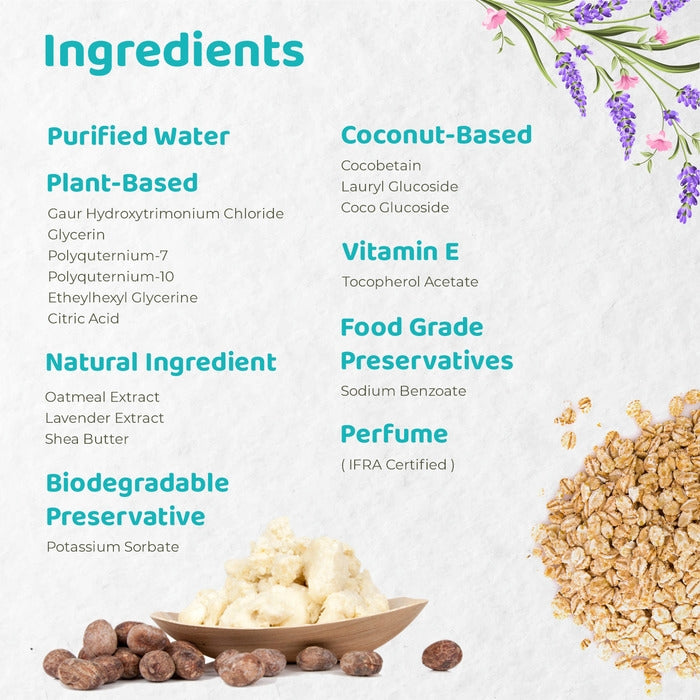All Ingredients: Aqua/Cocobetain/ Lauryl Glucoside/ Gaur Hydroxytrimonium Chloride/ Coco Glucoside/Glycerin/ Polyquternium-7/ Oatmeal Extract/ Lavender Extract/Vitamin E/Polyquternium-10/Shea Butter/Potassium Sorbate/Sodium Benzoate/Etheylhexyl Glycerin/Citric Acid/ Perfume (IFRA Certified)