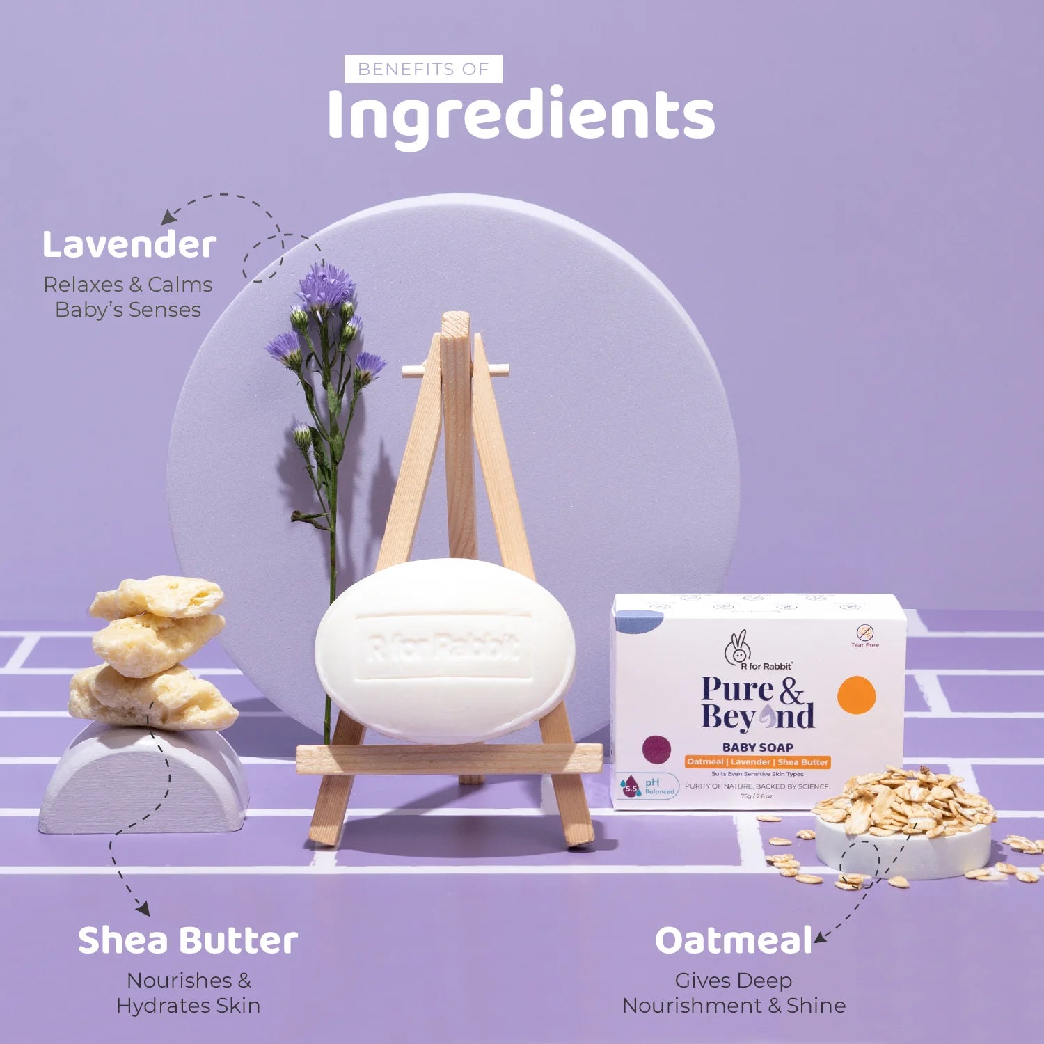 Babies love bath time, isn’t it? To make it even more relaxing and fun, R for Rabbit brings to you Pure & Beyond Soap for babies loaded with the goodness of Oatmeal, lavender, and shea butter as its main ingredients. Pure & Beyond baby soap helps to keep baby’s skin soft, moisturized, and hydrated, without triggering any kind of irritation or allergies. Mild on babies' skin and with a mild fragrance of lavender makes the bath time and after bath time more relaxing for the little munchkins.