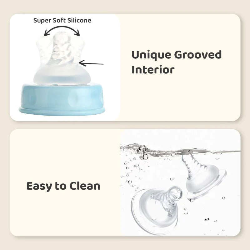 Super Soft Silicone Nipple: Made with soft silicon, the nipple mimics the look and feel of the breast and is best for the gums of babies