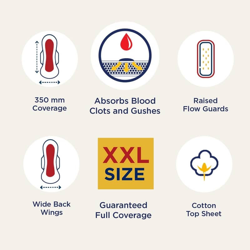 Its side wings, wide back wings and raised flow guards that are made of hydrophobic sheets protect from leaks and stains.