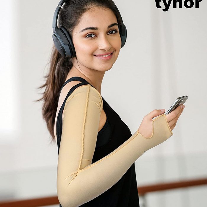 This compression garment is a specialized garment (Tynor Compression Garment Arm Sleeve Mitten With Thumb) like device, that provides support and graduated compression, in burns, lymphedema, varicose veins and other vascular conditions.