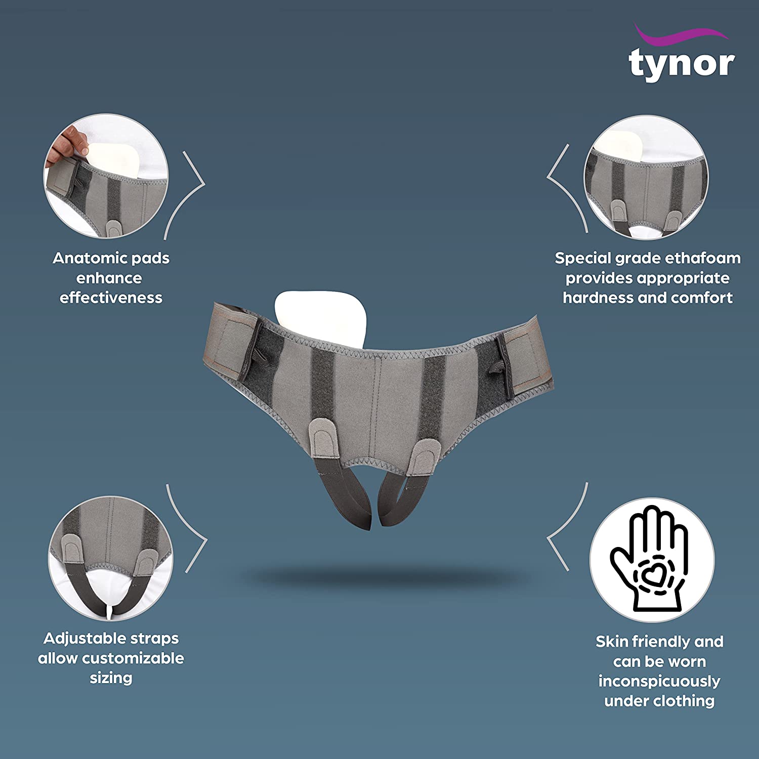 Tynor Hernia Belt provides gentle and constant relief from reducible inguinal hernias by providing adjustable and comfortable pressure to the hernia in order to reduce its size. By wearing the belt, the risk of herniation will be eliminated. In addition to being available in skin color, the Tynor Hernia Belt can also be worn under clothing in a completely inconspicuous manner.