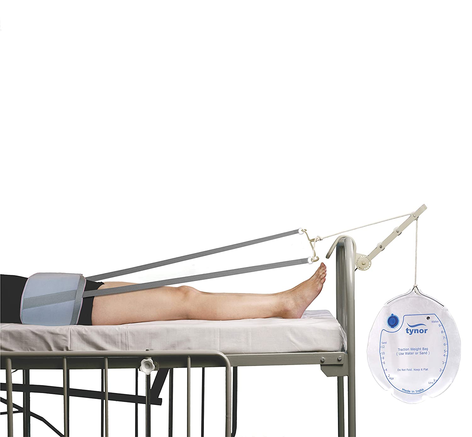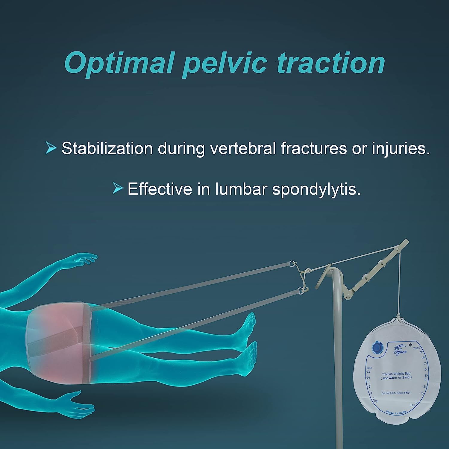 Pelvic traction belt is a traction halter which holds the pelvic area and pulls the sacral, lumbar and thoracic areas of the vertebral column. Pelvic traction belt through the slingg on the two sides get attached to the spreader bar, traction pulley bracket and the weights.