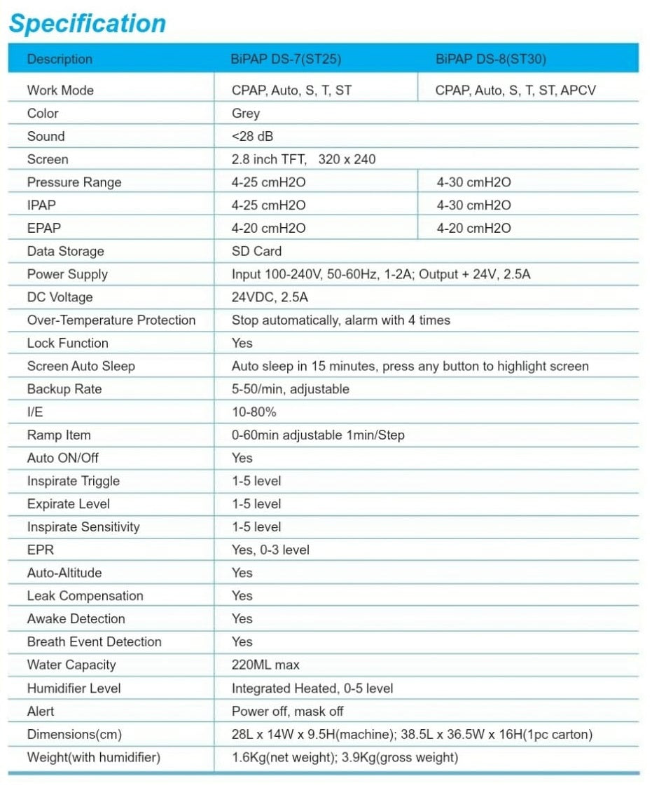 | Work Mode | CPAP, Auto, S, T, ST, APCV |