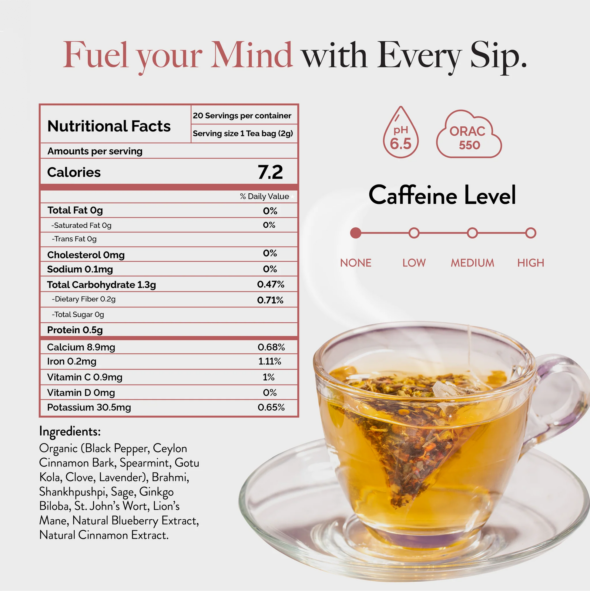 With our caffeine-free Focus Adaptogenic Herbal Tea, achieve a new level of mental clarity and unlock your full cognitive potential. Experience the transformative powers of Gotu Kola, Bacopa Monnieri, Ginkgo Leaf, Lion's Mane, and St. John's Wort, along with nine other potent ingredients, as they work in synergy to rejuvenate the mind. Each sip can help revitalize your mind and increase the production of essential brain chemicals like serotonin, dopamine, and norepinephrine.