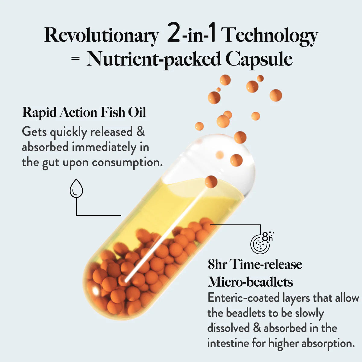 The 8-hour targeted-release formula ensures the slow release of bioactives in the small intestines effectively for higher absorption