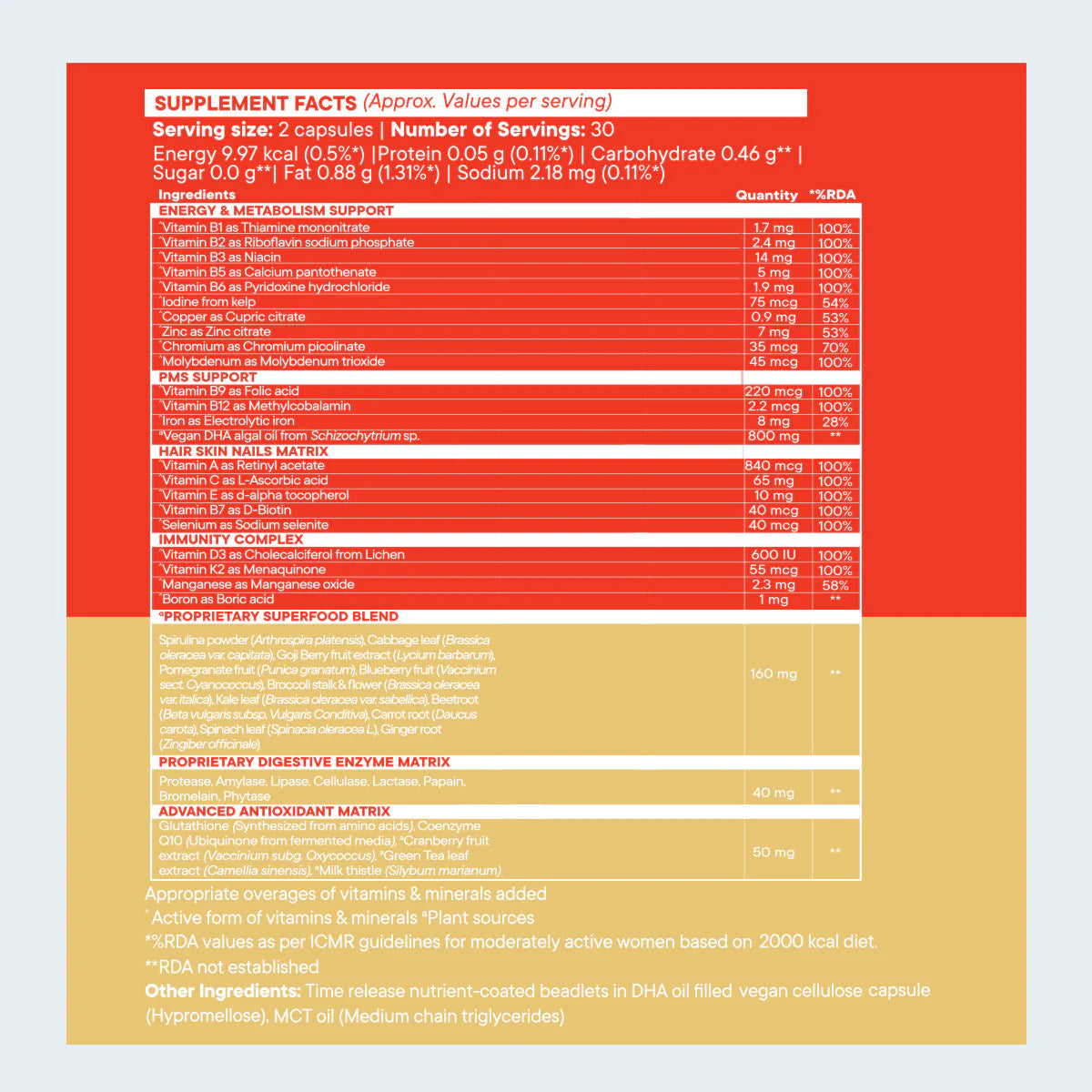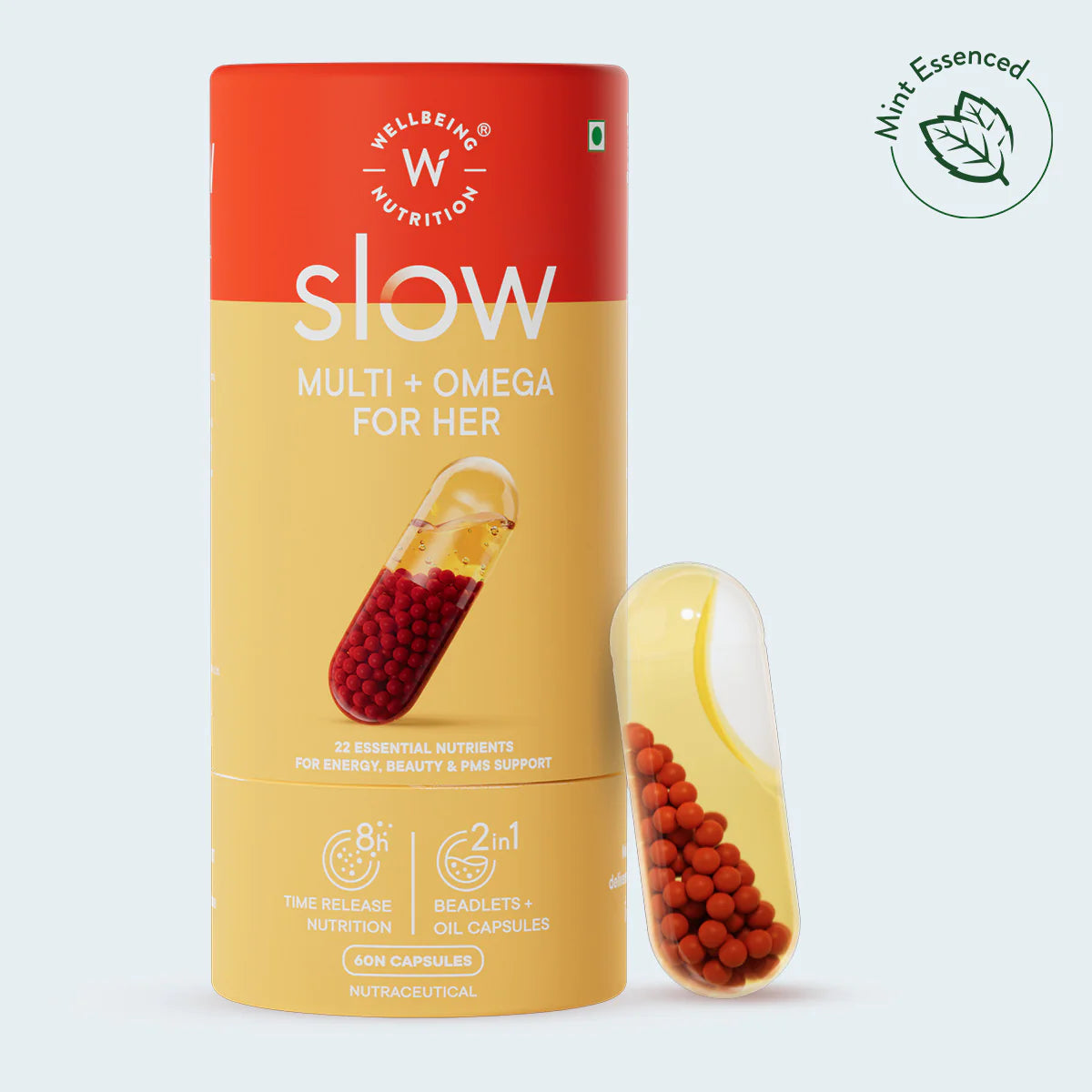 A single holistic capsule scientifically formulated to meet women’s specific needs by integrating 22 clinically proven nutrients, vegan omega-3 fats, and an exclusive superfood antioxidant blend. Tailormade for women aged 18 - 49 years, Slow Multi + Omega for Her is a unique multivitamin for women made using the 2-in-1 technology. Rapid-action vegan omega-3 oil combines with 8-hour time release microbeadlets for maximum bioavailability. One supplement for better metabolism, optimum immunity, healthy bones and joints and radiant beauty.